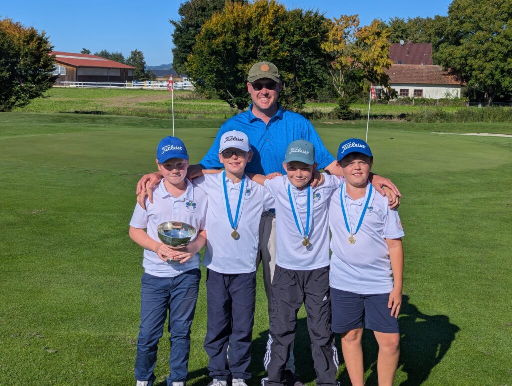 Die Fruhstorfer Buben kamen nicht nur trocken ins Clubhaus, sondern auch mit erfreulichen Ergebnissen. Allen voran Johannes Rabl, der mit 28 Nettopunkten als bester Einzelspieler ausgezeichnet wurde. Noch mehr Jubel kam bei den Gäuboys auf, als sie bei der Team-Siegerehrung als Beste mit 70 Punkten die Goldmedaille bekamen. Konrad Lehmayr und Emil Greß brachten dabei 25 bzw. 17 Punkte mit in die Wertung. Der Vorsprung zu dem Zweitplatzierten Bad Abbach betrug drei Schläge. Die Gewinner bekamen einen Sportbeutel sowie einen wertvollen Playmobil-Gutschein. Am meisten freuten sie sich aber, den silbernen Wanderpokal in Empfang nehmen zu dürfen, in den jetzt „2025 Golfclub Gäuboden“ eingraviert wird.